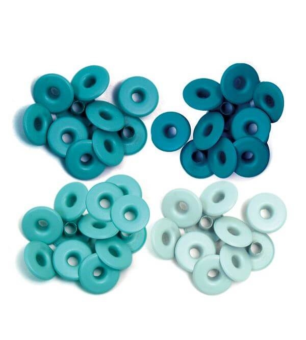 Incluye 40 eyelets en 4 tonos turquesa diferentes (8 de cada). Medida: 1,27 cm. Marca: We R Memory Keepers.