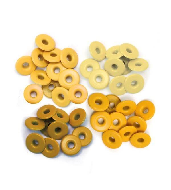 Incluye 40 eyelets en 4 tonos amarillo diferentes (8 de cada). Medida: 1,27 cm. Marca: We R Memory Keepers.