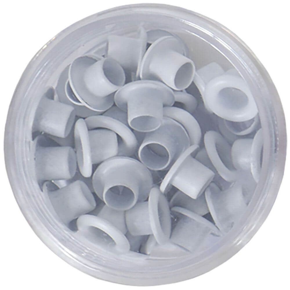 Caja con 40 ojales (eyelets) para proyectos de scrapbooking, tarjetería y otros trabajos de manualidades con goma eva, fieltro, etc. Material: aluminio. Tamaño ojales: 0.5 cm interior, 0.8 cm exterior Color: Blanco