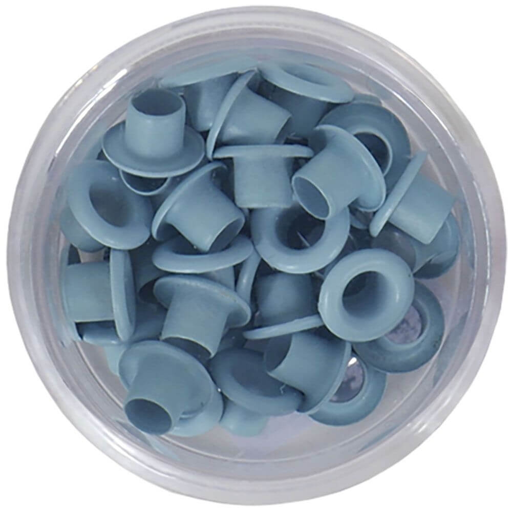 Caja con 40 ojales (eyelets) para proyectos de scrapbooking, tarjetería y otros trabajos de manualidades con goma eva, fieltro, etc. Material: aluminio. Tamaño ojales: 0.5 cm interior, 0.8 cm exterior Color: Aguamarina