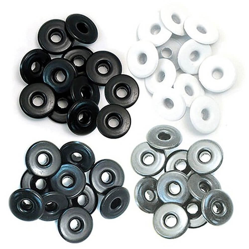 Eyelets, ojales de We R Memory Keepers. Estos eyelets metálicos están disponibles en muchos colores, este kit lleva cuatro colores de tonos grises, un total de 40 unidades, 10 de cada color, como se pueden ver en la foto. Sirven para colocarlos con tu Crop a Dile, con la que harás tus agujeros y podrás colocar los ojales. Perfectos para todo tipo de trabajos de manualidades, scrapbook. Al tener un largo cuello podremos poner varias hojas o incluso cartón contracolado. Tamaño ojales: 0.5 cm central, 1.3 cm cabeza.
